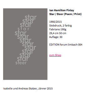 In 2015 in Vienna I found a reprinting of the classic poem-print Star / Steer, which Stuart Mills and I had issued from Tarasque Press, Nottingham in 1966. The original was beautifully screenprinted on MG poster paper. It avoided the pitfall of the numbered and editioned fine-art print, and was the epitome of Finlay’s overtly available poster-poem. Suddenly, I was shown a fine print, done on fancy paper in a very limited edition of 30 copies, and selling for some €1200. The positioning of the poem was bizarre to say the least, so high on the format. I was informed that a notebook had been discovered in which Ian Finlay had said he wanted the print to be placed behind a toy boat?