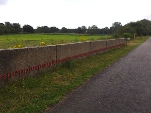 The seven slabs of airfield concrete were taken from RAF Swinderby down the road further south, skilfully sawn and transplanted from flat to vertical in 2002. The next year, Erica and I glued on the orange anodised aluminium letters with the fiercest epoxy and a contraption that allowed it to set. But it was not strong enough for the long term, and any lone cyclist with a screwdriver could prise off a ‘p’ as a momento, or ‘poppie’ for their mantelpiece. Fortunately we lost very few, and there were a few spares.